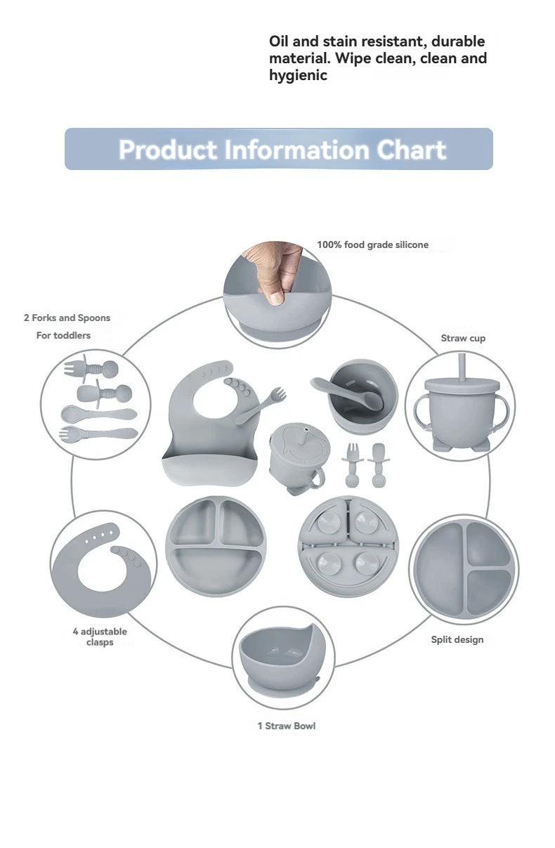 The set includes essentials like suction-based bowls and plates for stable mealtime moments, plus ergonomic forks, spoons, cups, straws, and a flexible bib to keep learning mess-free. Every detail is made to encourage independence while keeping comfort and safety at the forefront.